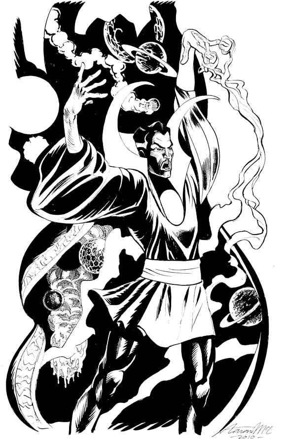 Here’s something. A sketch of Dr. Strange after the unique visionary Steve Ditko. I’ve depicted Strange using his powers over the mists of deep space that exist within shadows, dontchaknow?