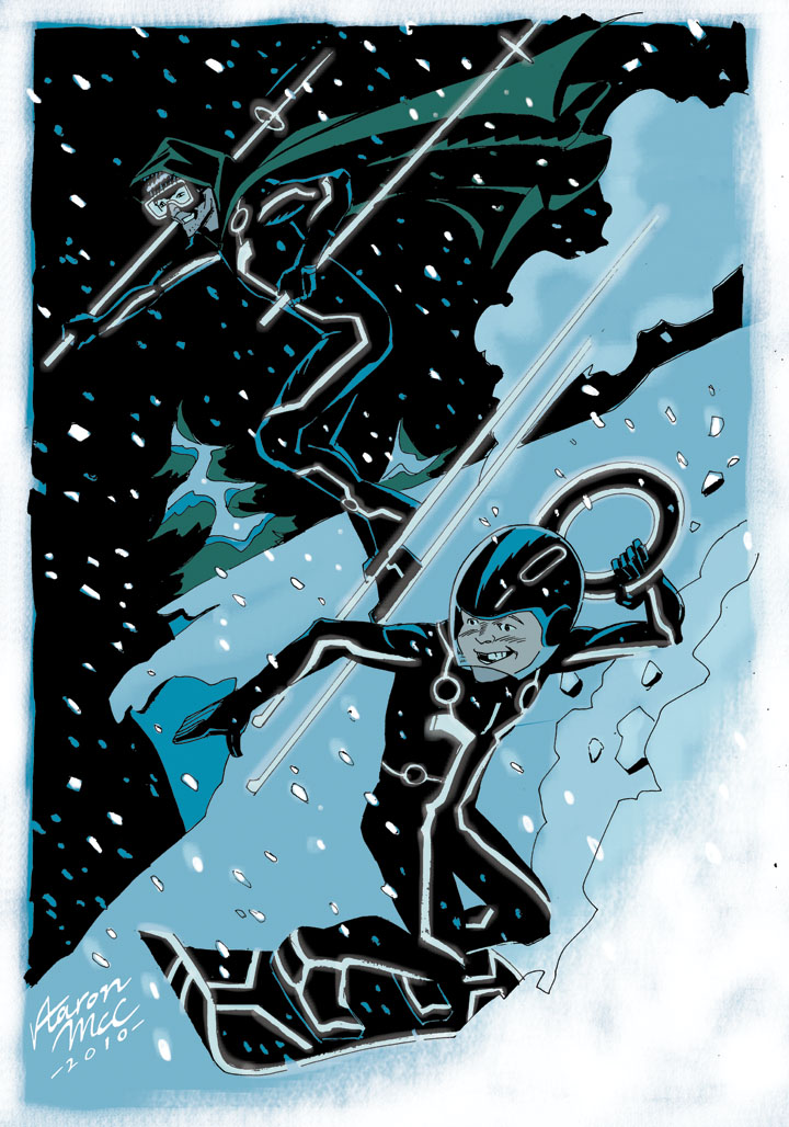 Two adventures this week (so far). I went downhill skiing with my son for his birthday. He was on a snowboard, and that seems to be the preference based on the SkiBowl crowd up Mt. Hood. The other adventure was seeing TRON: Legacy last night! I was fully immersed in the grid. Loved it! So here’s a little tribute to those two events. **This may be the most idyllic drawing I’ve done of myself, possibly ever. I guess I’m ending 2010 on a positive note.**