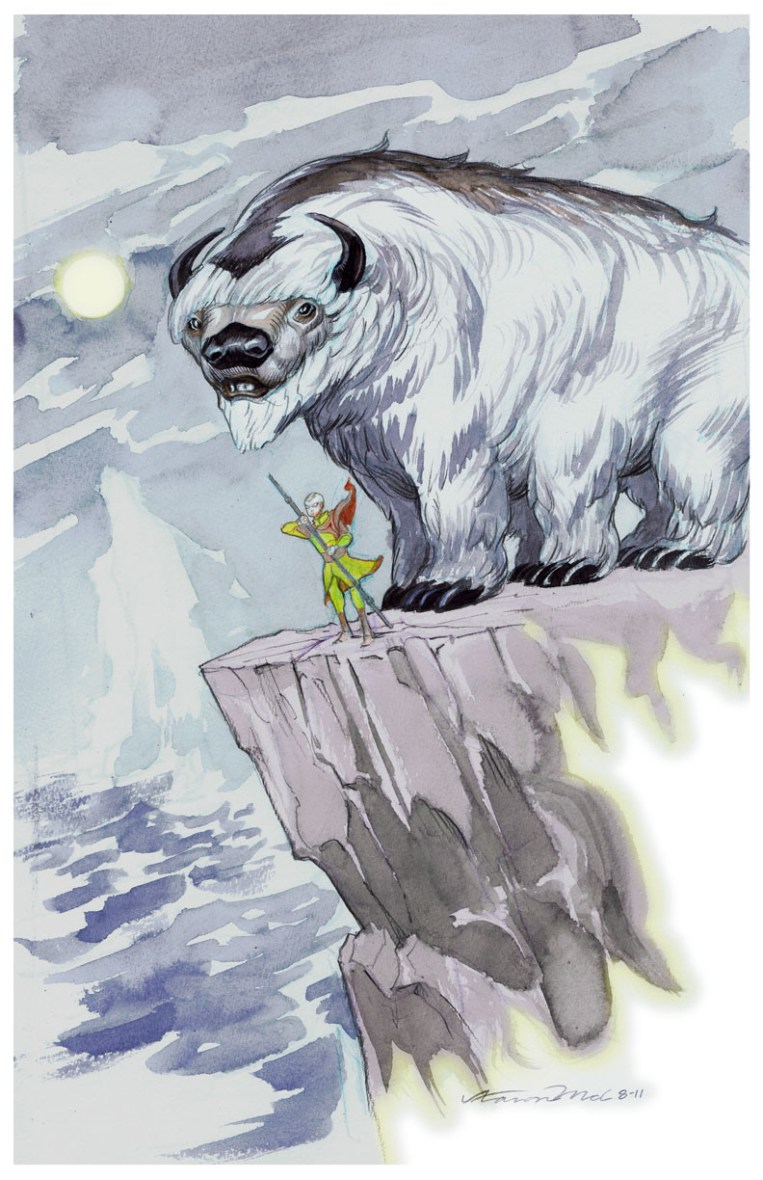Thanks for the comment! And no I don’t think that’s weird. This is a drawing that I would like to do a more finished version of because I can see clearly how to improve it. Appa would look less like a Heffalump, for one thing, the full moon atmosphere could be played up and the mysterious flames in the foreground need more heat. The cliff probably wouldn’t change much, though, so I agree with you.