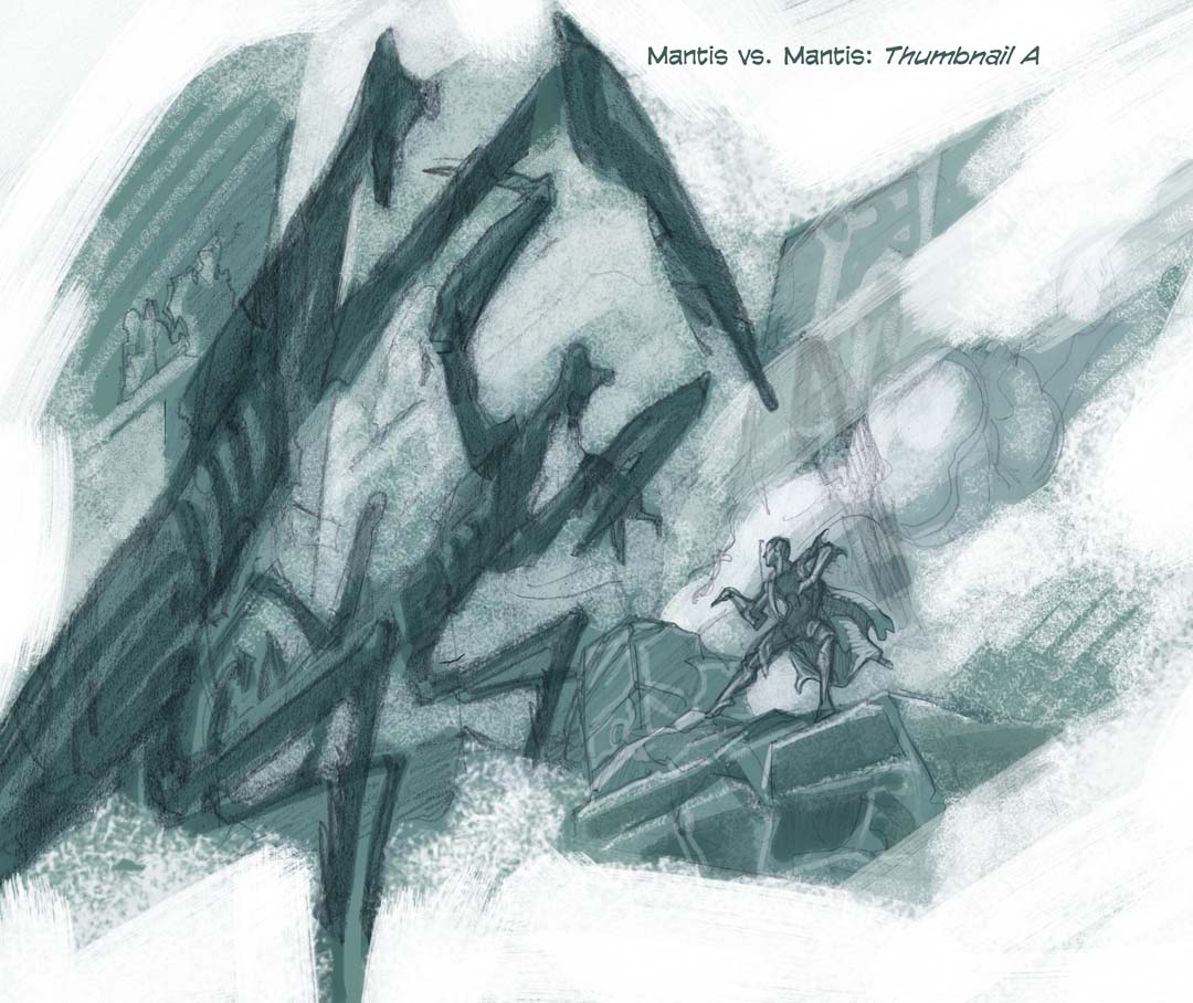 It’s a process post for 13 True Ways! I had fun doing these posts for some of the 13th Age core book art about 2 years ago that I called “Behind-the-Illustration”. The first image below is a preliminary pencil sketch in blue and red col-erase pencils. You can see a little thumbnail scribble in blue, top left: