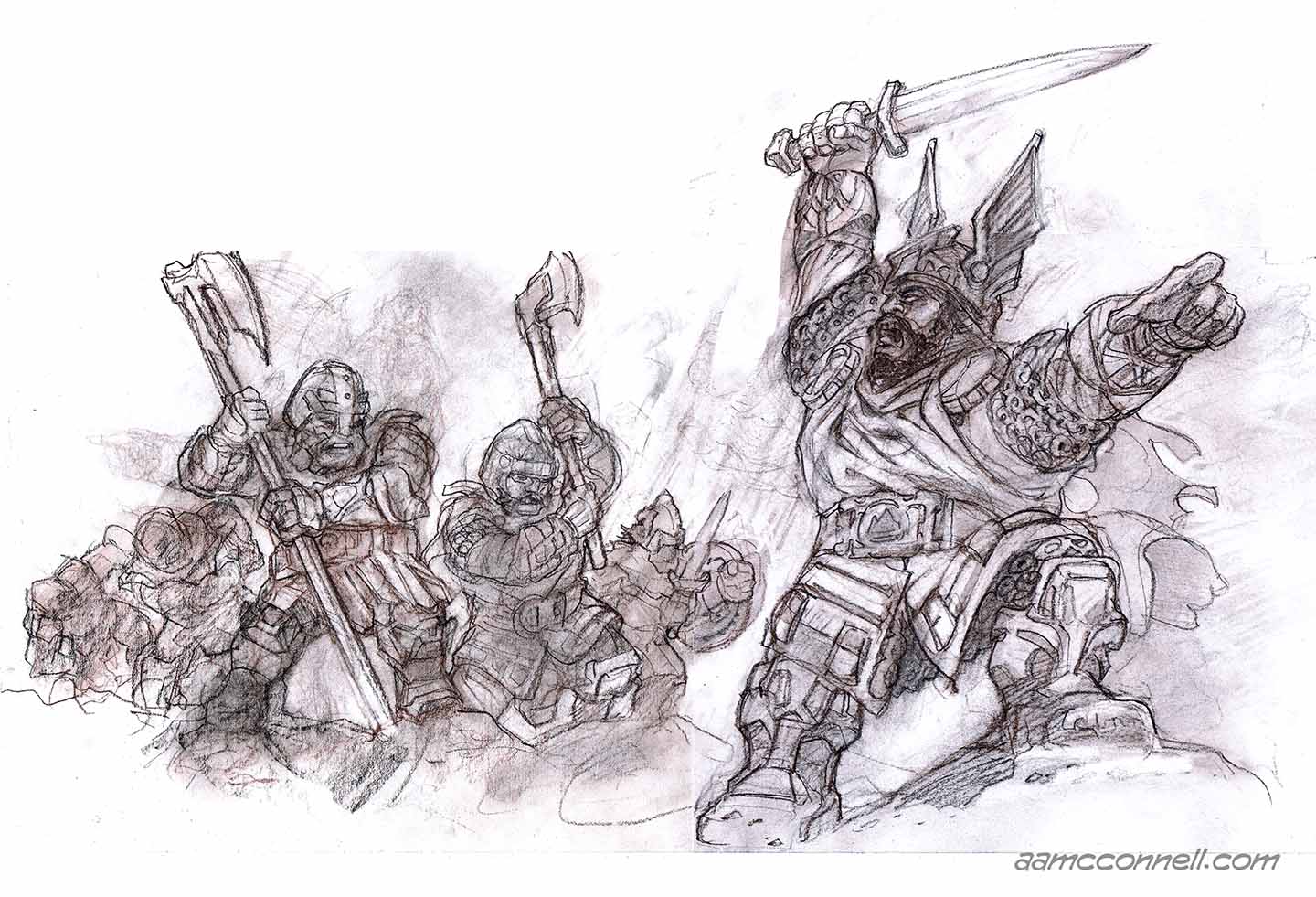 I’ll work backward on the process this time around, for some variety. Below is the original image that I sent Lee Moyer. Lee added the Emperor’s flag to the final illustration, as you can see above, not to mention greater contrast and golden light illuminating the scene. (Could that light be reflecting from a guarded treasure trove, perhaps? Or perchance they have encountered the fleeting essence of The Gold Wyrm?!)![]()