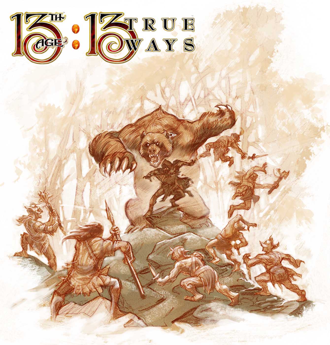 Today I’m peeling back the process of creating the illustration of the Great Bear Druid found in the upcoming 13 True Ways book. This piece almost got the cut because I think both Rob Heinsoo and myself may be a little overeager when it comes to the druid class. There may have been a concern that the druids were overtaking the book, but evidently enough balance was restored to keep this piece. This drawing came together rather quickly. Below is my sketchbook page of the druid summoning his Spirit Bear and then a smattering of ungainly goblins. The next stage was done in Photoshop. I arranged the various sketch elements into a composition and added some digital paint. Lee Moyer swung his sorcerer’s wand around and brought contrast and clarity to the image. One thing I’ve learned from working with Lee is the importance of creating a composition that can still read when reduced to the size of a postage stamp, a valuable “big picture” skill that he has keenly developed.