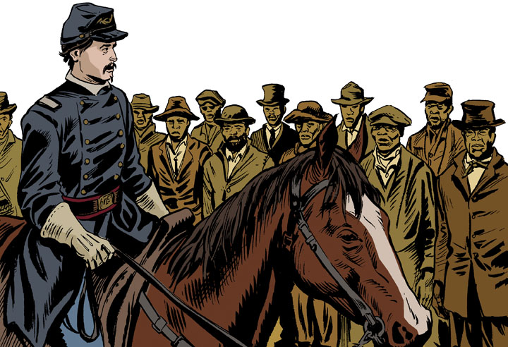 Here are some snippets of finished art from the comic I recently illustrated about the 54th MASS regiment. Frederick Douglass makes a “cameo” in the opening pages as he is recruited to recruit volunteers for the regiment.