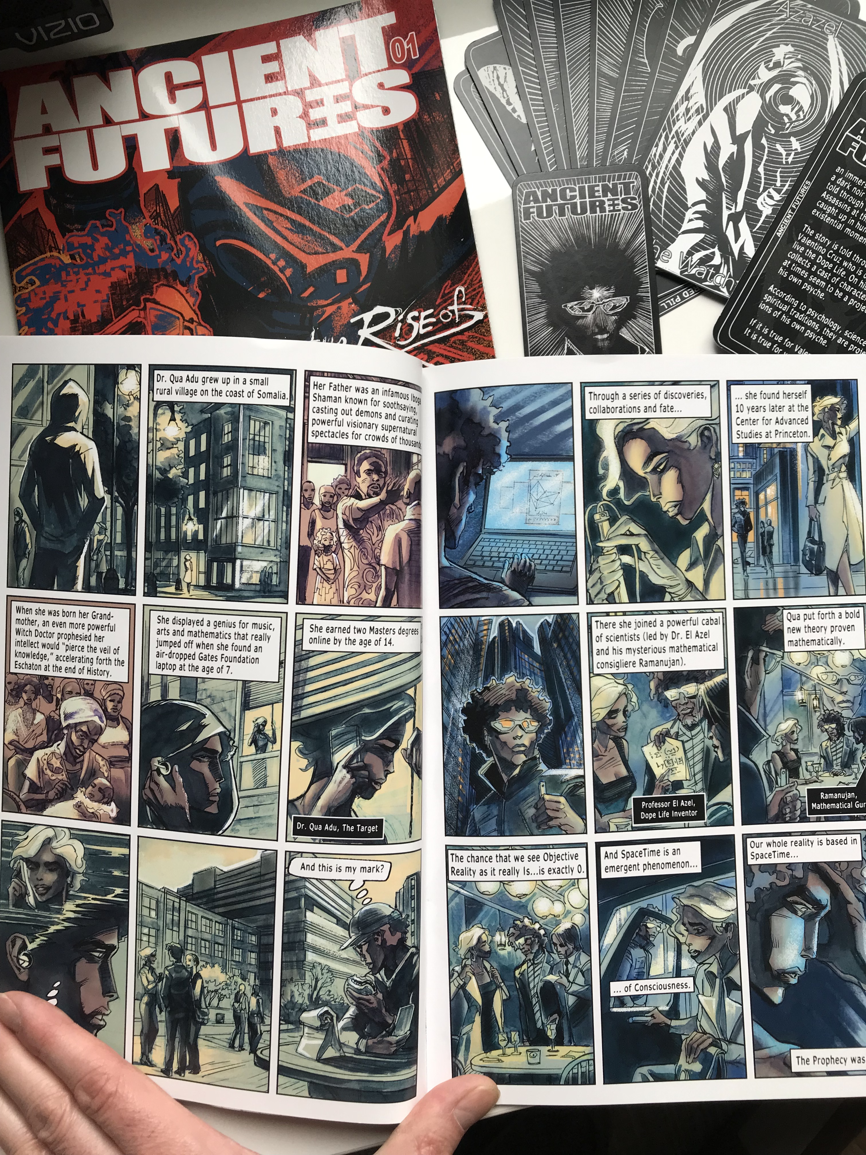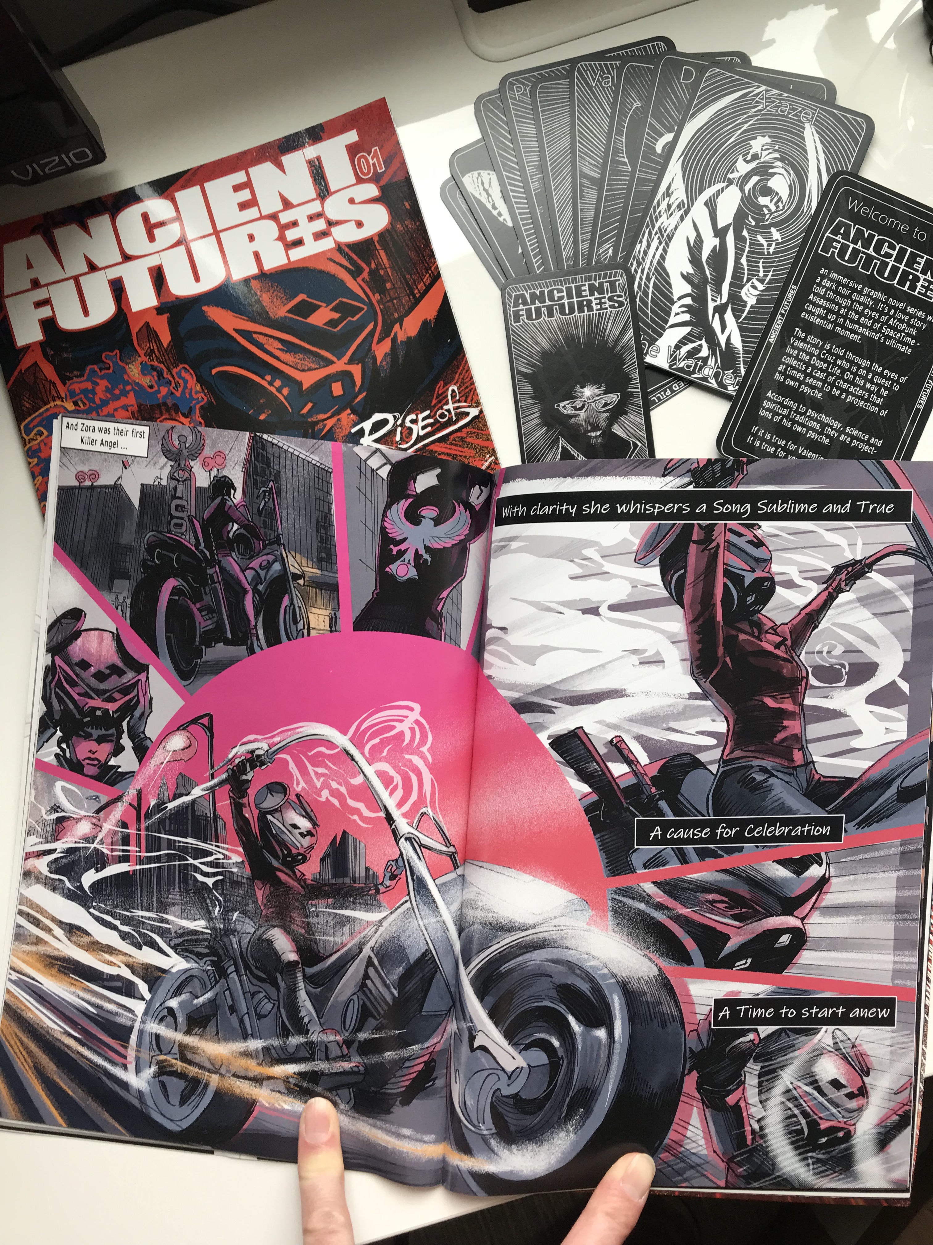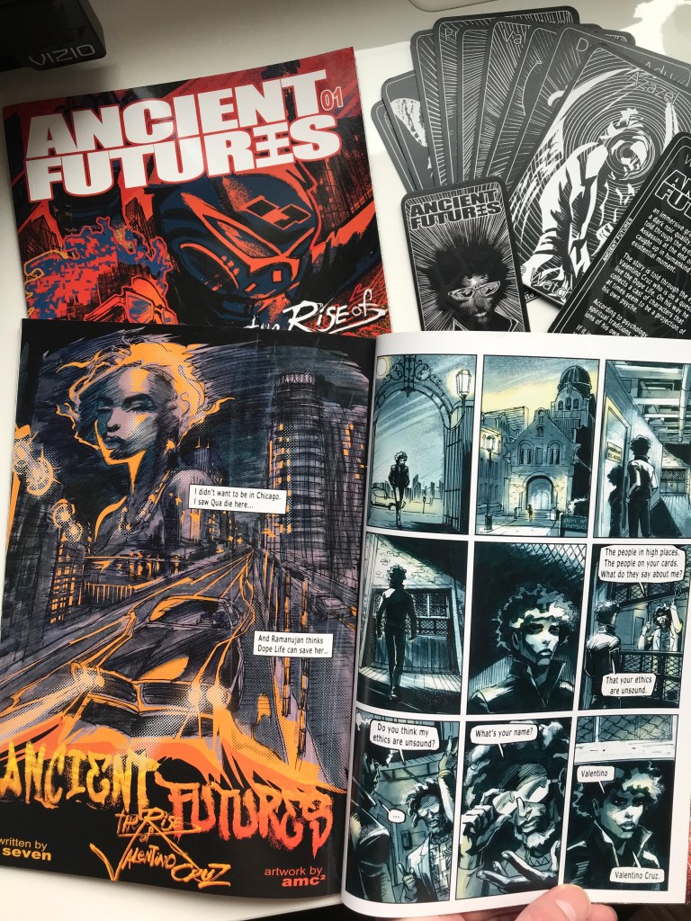 The photo collage above includes pictures from Chicago Comic & Entertainment Expo (C2E2) where Steven (writer) and I (artist) introduced readers to our first printed volume of Ancient Futures and we’re happy to report it was warmly received, including enthusiastic response to the visuals as well as the catchy tagline for the book “Afropunk Assassins at the end of SpaceTime!” Other creative individuals (photographers, sculptors, actors, tarot readers, cosplayers) are getting involved in the project and we’re very excited to witness its development in ways that we couldn’t have imagined when Ancient Futures started about 2 and half years ago.