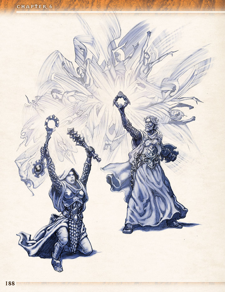 I couldn’t help waxing nostalgic about how I got involved in this project back in 2012. I had no idea how many hours and how much enthusiasm I would foster for the project between then and now. My very first illustration for 13th Age was a pencil drawing of the Archmage, if I remember correctly. You can see this Announcement Post about that piece back then. I was trying to remember which interior piece I worked on first and I don’t know if it was the absolute first, but the Clerics were definitely one of the earliest. These are the clerics as seen on page 188 of the core book: I hadn’t seen what Lee Moyer did to finish this piece until I saw it printed in the book, 2013. You can image what a treat that was for me. My memory of the piece was the pencil version that I handed over to Lee the previous year as seen here: Below is the rough sketch that I submitted to Rob Heinsoo. I hadn’t figured out how I was going to depict those spirits emanating from the male cleric’s magic item, and apparently it was compromised by the Diabolist because demonic spirits seem to be escaping rather than angelic ones! The clerics in this sketch were a bit light on armor for Rob’s taste, so I think he sent me some snapshots of tabletop miniatures for reference, but I can’t find them! It was all the way back in 2012 after all. Seems like Ages ago…