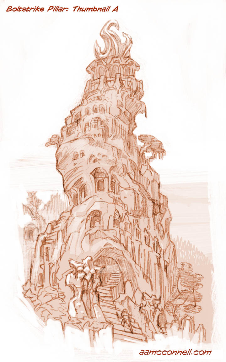 Boltstrike Pillar appears in Chapter 10, the “Blood and Lightning” adventure in the 13th Age core book. Below is the rough draft and a bonus sketch for a different adventure that Rob was toying with at the time.