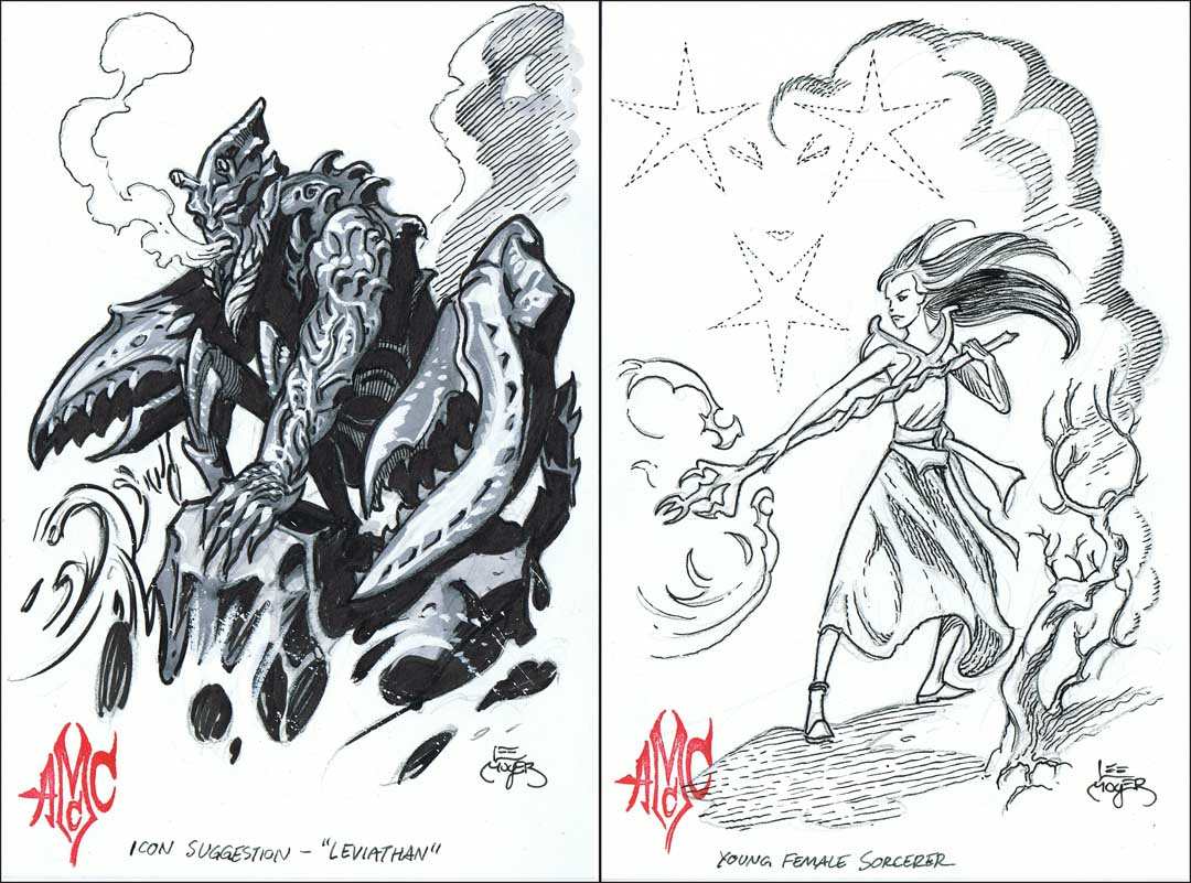 The last time I attended a convention was PAX in Seattle last year and it was a good time. At one point, Lee Moyer and I were both at the table drawing collaborative sketches based on suggestions from fans of 13th Age. The two examples shown at the top of this post are The Leviathan, described to have a “lobster-esque body with the torso and head of a man, braided beard and eyes without pupils,” and an “11 year old sorcerer girl with ties to the Elf Queen.”